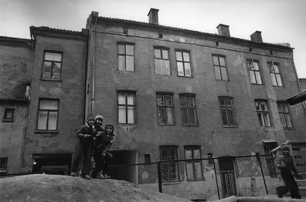 Innvandrernes boforhold. Tre jenter smiler til fotografen og et barn løper. Med bakgården som lekeplass. Fotografiet er fra prosjektet og boka ''Oslo-bilder. En fotografisk dokumentasjon av bo og leveforhold i 1981 - 82''. Kontakt Samfoto ved ev. bestilling av kopier.