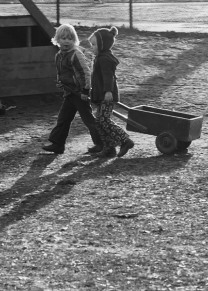 To barn som trekker en kjerre. Barneparken i Sofienbergparken? Fotografiet er fra prosjektet og boka ''Oslo-bilder. En fotografisk dokumentasjon av bo og leveforhold i 1981 - 82''. Kontakt Samfoto ved ev. bestilling av kopier.