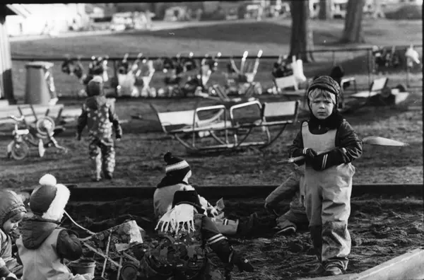 Barn i lek i sandkassa. Barneparken i Sofienbergparken. Fotografiet er fra prosjektet og boka ''Oslo-bilder. En fotografisk dokumentasjon av bo og leveforhold i 1981 - 82''. Kontakt Samfoto ved ev. bestilling av kopier.