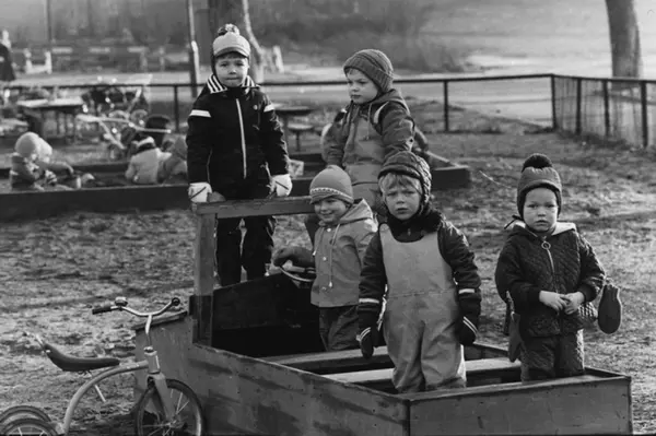 Barn i lek i " båt". Barneparken i Sofienbergparken. Fotografiet er fra prosjektet og boka ''Oslo-bilder. En fotografisk dokumentasjon av bo og leveforhold i 1981 - 82''. Kontakt Samfoto ved ev. bestilling av kopier.
