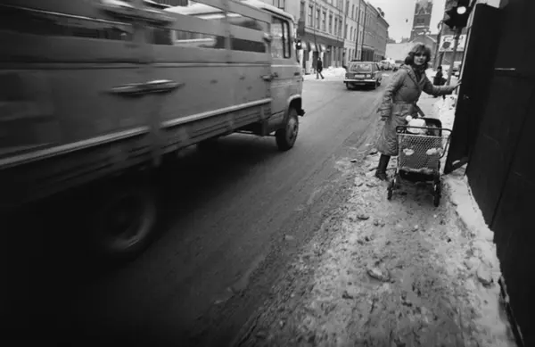 Mor med barnevogn i trafikkmiljø vinterstid. Lastebil som "suser" forbi. Bildet er publisert på s. 34 i boken Oslo-bilder. Fotografiet er fra prosjektet og boka ''Oslo-bilder. En fotografisk dokumentasjon av bo og leveforhold i 1981 - 82''. Kontakt Samfoto ved ev. bestilling av kopier.