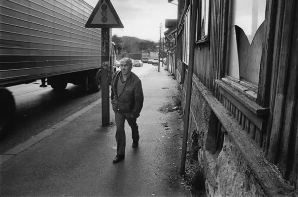 Småhusbebyggelse med innfartsvei fra nord. Istykkerslått rute i nedslitt småhus. Mann på fortauet. Tungtrafikk. Fotografiet er fra prosjektet og boka ''Oslo-bilder. En fotografisk dokumentasjon av bo og leveforhold i 1981 - 82''. Kontakt Samfoto ved ev. bestilling av kopier.
