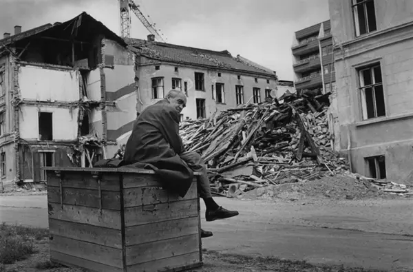 Eldre mann ser på bebyggelse som rives. Bildet er publisert på s.138 i boken Oslo-bilder. Fotografiet er fra prosjektet og boka ''Oslo-bilder. En fotografisk dokumentasjon av bo og leveforhold i 1981 - 82''. Kontakt Samfoto ved ev. bestilling av kopier.