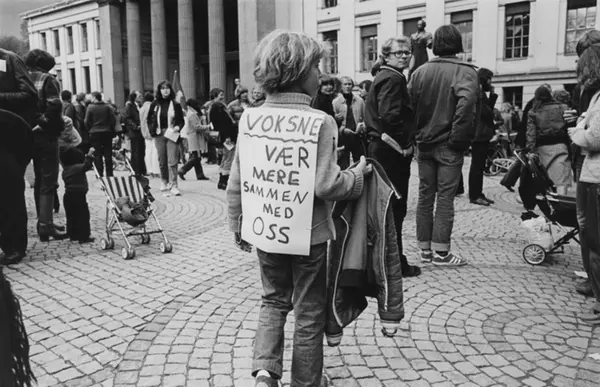 Demonstranter på Universitetsplassen på 1. mai. Gutt med plakat på ryggen. "Voksne vær mere sammen med oss". Fotografiet er fra prosjektet og boka ''Oslo-bilder. En fotografisk dokumentasjon av bo og leveforhold i 1981 - 82''. Kontakt Samfoto ved ev. bestilling av kopier.
