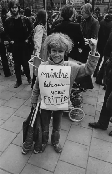 Demonstranter på Universitetsplassen på 1. mai. Gutt med plakat og knyttet neve. "mindre lekser - mere FRITID". Fotografiet er fra prosjektet og boka ''Oslo-bilder. En fotografisk dokumentasjon av bo og leveforhold i 1981 - 82''. Kontakt Samfoto ved ev. bestilling av kopier.