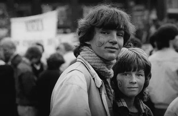 Ungdom i fredsdemonstrasjon. Fotografiet er fra prosjektet og boka ''Oslo-bilder. En fotografisk dokumentasjon av bo og leveforhold i 1981 - 82''. Kontakt Samfoto ved ev. bestilling av kopier.