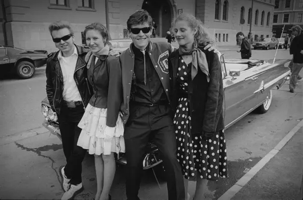 Rockere med amcar foran Møllergata. Muligens innspilling av den norske filmen 50/50, sommeren 1981. Fotografiet er fra prosjektet og boka ''Oslo-bilder. En fotografisk dokumentasjon av bo og leveforhold i 1981 - 82''. Kontakt Samfoto ved ev. bestilling av kopier.