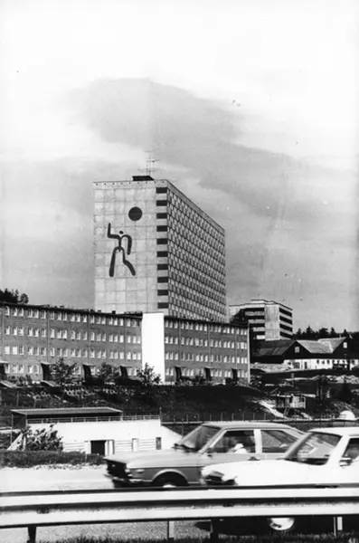 Skiveblokkene i Ammerudlia borettslag, Trondheimsveien i forgrunnen. Fotografiet er fra prosjektet og boka ''Oslo-bilder. En fotografisk dokumentasjon av bo og leveforhold i 1981 - 82''. Kontakt Samfoto ved ev. bestilling av kopier.