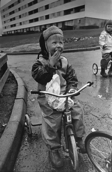 Barn på trehjulssykkel. Fotografiet er fra prosjektet og boka ''Oslo-bilder. En fotografisk dokumentasjon av bo og leveforhold i 1981 - 82''. Kontakt Samfoto ved ev. bestilling av kopier.