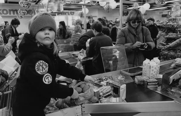 Fra kasseområdet på shoppingsenteret. Fotografiet er fra prosjektet og boka ''Oslo-bilder. En fotografisk dokumentasjon av bo og leveforhold i 1981 - 82''. Kontakt Samfoto ved ev. bestilling av kopier.