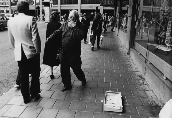 Gatemusikant. Eldre mann med munnspill. Fotografiet er fra prosjektet og boka ''Oslo-bilder. En fotografisk dokumentasjon av bo og leveforhold i 1981 - 82''. Kontakt Samfoto ved ev. bestilling av kopier.