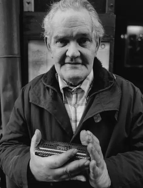 Gatemusikant. Eldre mann med munnspill Fotografiet er fra prosjektet og boka ''Oslo-bilder. En fotografisk dokumentasjon av bo og leveforhold i 1981 - 82''. Kontakt Samfoto ved ev. bestilling av kopier.