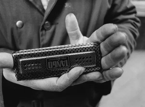 Gatemusikant. Eldre mann med munnspill Fotografiet er fra prosjektet og boka ''Oslo-bilder. En fotografisk dokumentasjon av bo og leveforhold i 1981 - 82''. Kontakt Samfoto ved ev. bestilling av kopier.