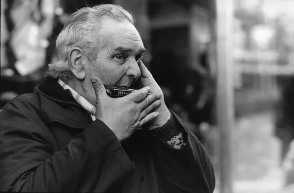 Gatemusikant. Eldre mann med munnspill Fotografiet er fra prosjektet og boka ''Oslo-bilder. En fotografisk dokumentasjon av bo og leveforhold i 1981 - 82''. Kontakt Samfoto ved ev. bestilling av kopier.