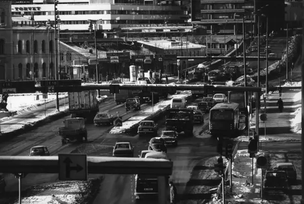 Trafikkmiljø og rushtrafikk fra Rådhusplassen ved Vestbanestasjonen opp Dronning Mauds gate. Vika-torget i bakgrunnen til venstre. Fotografiet er fra prosjektet og boka ''Oslo-bilder. En fotografisk dokumentasjon av bo og leveforhold i 1981 - 82''. Kontakt Samfoto ved ev. bestilling av kopier.