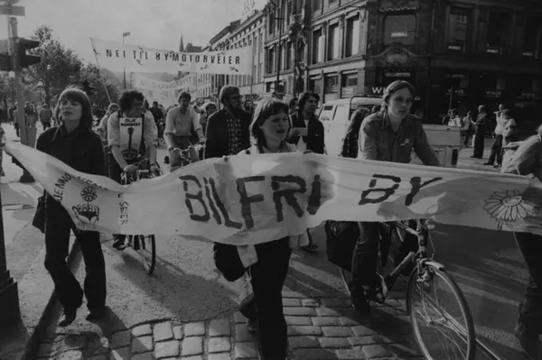 "Bilfri by"- aksjon på Rådhusplassen. Syklende og gående ungdommer. "Nei til bymotorveier". Fotografiet er fra prosjektet og boka ''Oslo-bilder. En fotografisk dokumentasjon av bo og leveforhold i 1981 - 82''. Kontakt Samfoto ved ev. bestilling av kopier.