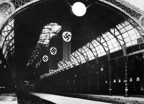 Østbanestasjonen, nazisymboler, banner med hakekors, krigsårene 1940-1945. Bildet viser utsmykning i forbindelse med Joseph Goebbels besøk i Oslo 28. november 1940.