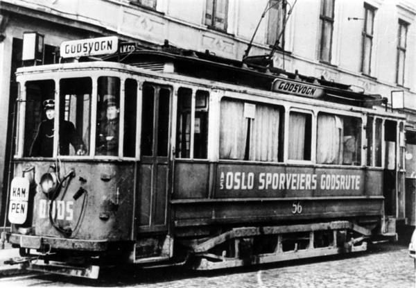 Oslo Sporveiers vogn nr. 56 ombygget som godsvogn på vei til Kampen. Ingen av betjeningen ombord var tillatt å sitte under fart. I en periode kunne bedrifter kjøpe godsruter av Oslo Sporveier.