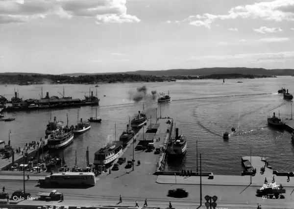 Rådhusbryggene, passasjerbåter, busser. Ved utstikker A: På østsiden ligger DS Nesodden. På vestsiden ligger DS Ursvik innerst, og DS Bundefjord ytterst. Ved utstikker B: Innerst på østsiden ligger DS Kronprins Olav, deretter DS Spro og ytterst DS Nesodtangen. På vestsiden DS Oscarsborg I. På vei utover, i forlengelsen av utstikker B, går DS Oksvald. I høyre billedkant ser vi DS Fjellstrand lengst unna. På kaia, rett innenfor fiskebåtene ser vi "Ormen Lange". Dette var en meget spesiell"buss som trafikkerte ruten Oslo - Hønefoss. Den var egentlig et vogntog, bestående av trekkvogn og semitrailer. Semmitraileren, altså passasjerdelen, hadde hjul bak, mens forparten hvilte på en svingskive på trekkvognen. Postkort.