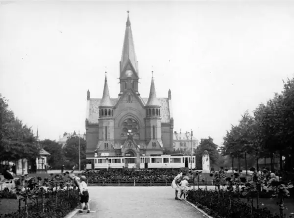 Oslo Sporveier. Parkmiljø med barn på Sagene. Sagene kirke sett fra Gråbeinsletta. Kirken er tegnet av arkitekt Christian Fürst i nygotikk, med rød fuget tegl, spir og tak tekket med skifer. (Kirken ble pusset opp innvendig 1956.)