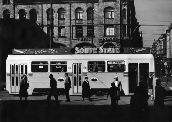 Linje 1, Sinsentrikken, høka-vogn 651sett fra Østbanestasjonen. Nedre del av Karl Johans gate. Reklame for South State. Butikk: Olav Thons Pels import.