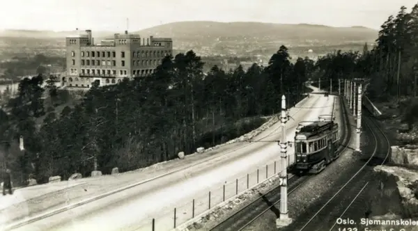 Ekebergbanen (dobbeltsporet) langs Kongsveien opp fra Sjømannsskolen i Ekebergskråningen. Gammel motorvogn (kallenavn Vikingskip) på linjen. Postkort med nummer 1433. Sannsynligvis fra 1920-tallet.