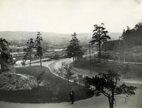 Kongsveien og Ekebergbanen opp mot Sjømannsskolen. Trikk (motorvogn) kalt Vikingskip. Statuen Helhesten (fra 1921) til venstre. Utsyn mot byen og Bjørvika med bl. a. Oslo havnelager, Nylands Verksted og kullageret på Paulsenkaia.