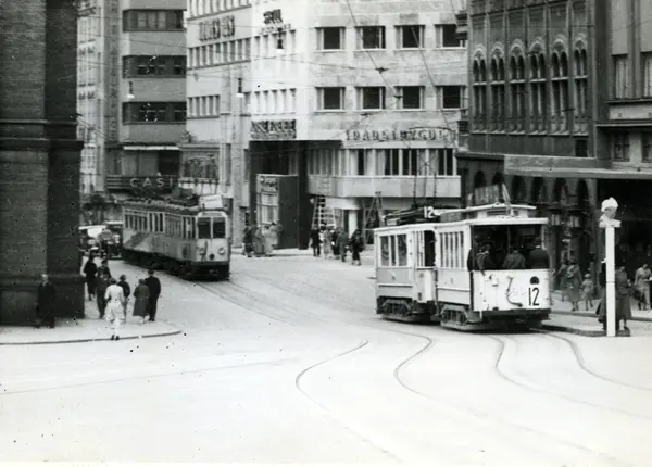 Oslo Sporveier. Trikk, motorvogn med åpen tilhenger 499 på linje 12, Majorstuen-Kampen, i Stortingsgata ved Hotel Continental. Motgående A-vogn i tog. Høyres Hus (fra 1935) til venstre og Casinobygningen. Spaserende. Bildet sannsynligvis fra andre halvdel av 1930-tallet.