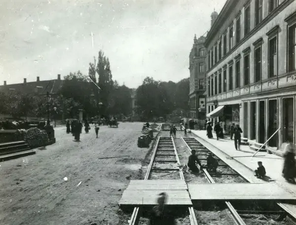 Fra anleggingen av Sagenebanen i 1898-1899. I venstre bildekant søndre oppkjørsel til Trefoldighetskirken. I bakgrunnen til venstre Empirekvartalet med Militærhospitalet og Fødselsstiftelsen. I bakgrunnen til høyre Togagården på hjørnet Akersgaten/Teatergaten.