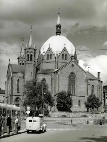 Trefoldighetskirken ved Akersgata. Trefoldighetskirken i Oslo ble vigslet i 1858 av biskop Jens Lauritz Arup. Den er en sentralkirke i nygotikk, med to klokketårn og en åttekantet kuppel hvelvet over fire fløyer. Utførende arkitekt Wilhelm von Hanno sto selv bak mange av interiørdetaljene i kirken. Claus Jensen bygget hovedorgelet i 1872, Adolph Tidemand malte altertavlen i 1886, Emanuel Vigeland lagde lysekronen i 1923 og Frøidis Haavardsholm lagde glassmaleriene i 1936.