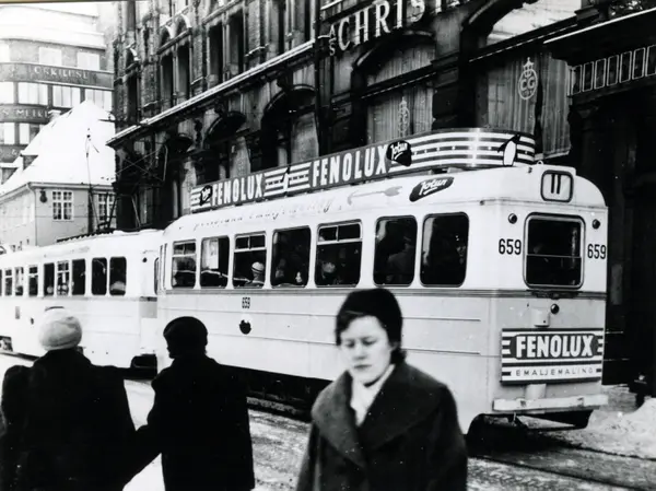 Oslo Sporveier. Tilhenger 659 kalt "stivkjelke". Linje 11 til Majorstuen, her ved Stortorvet stoppested inntil GlasMagasinet. Reklame for Fenolux maling.