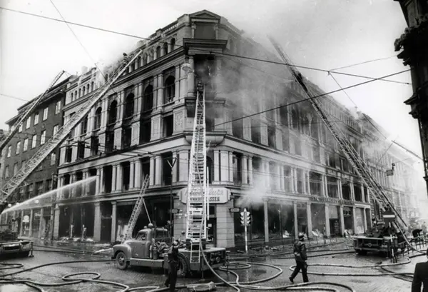 Brann i forretningsgården i Karl Johans gate 15 (Robsahmgården) med bl.a. Kreditkassens reisevalutaavdeling og Statsbanenes reisebyrå. Slukningsarbeide. Brannbiler, brannstiger, brannmenn. Gården ble revet senere (som gården bortenfor ved Stortorvet), og Kreditkassens hovedkontor fra 1970 ble bygget på tomten, mere tilbaketrukket fra Karl Johans gate.
