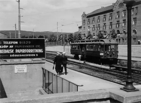 Oslo Sporveier. Holmenkollbanens 100-vogn på vei ut av stasjonen, betjening på vei til brakka, trapp til undergang. Reklame for Sørkedalsveien papirforretning. Slemdalsveien med daværende Statens Politiskole, nåværende Politihøgskolen i bakgrunnen. Bildet tatt av ukjent tysk soldat.