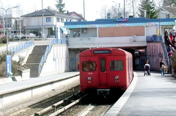 Oslo Sporveier. Østensjøbanen. T-banevogn 1040, serie T1, på linje 3 på utgående, her ved Oppsal stasjon. Reisende. Narvesenkiosk, ekspedisjonsbyging med lemmer for vinduene.