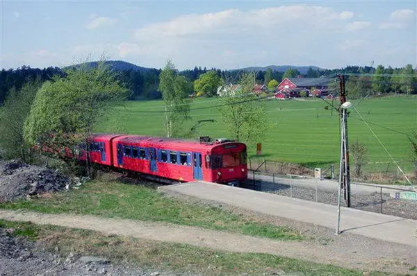 Oslo Sporveier. Kolsåsbanen. T-banevogn 1310, serie T5, i tog på linje 4 fra Kolsås, her mot Gjønnes stasjon. Gjønnes gård og Gjønnesjordet i bakgrunnen.