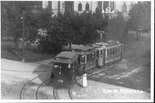 Blåtrikken. Trikk tilhenger 172 type Union og Herbrand motorvogn i øvre Stortingsgata ned fra Drammensveien. Parken vest for Nationaltheatret (nåværende Johanne Dybwads plass). Bildet tatt en gang mellom 1909-1915.
