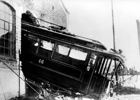 Trikk type U nr. 46, kjørt gjennom endeveggen i vognhallen på Torshov, vognvasker skulle kjøre fram vogna, men fikk ikke stoppet i tide pga. glatte skinner (vann etter vasking).