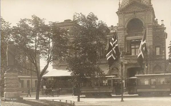 Inngangsbygningen til Tivoli i Stortingsgata, med norske flagg. Blåtrikken, trikk motorvogn 135 type U (fra 1902) og tilhenger 152 type Bautzen (fra 1899) i Stortingsgata ved Ibsenstatuen. Hest og kjerre. Universitetsgata (nåværende Roald Amundsens gate) inn til venstre.
