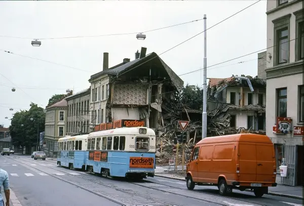 Oslo Sporveier. Trikk Høkatilhenger 555 type TBO linje 2 fra Disen ned Vogts gate. Hus (Vogts gate 10) under riving etter brann ved hjørnet Vogts gate - Marcus Thranes gate. Hjørnekvartalet ble i 1990 revet revet for å gi.plass til den sterkt trafikkerte Kirkeveiringen. Portalbygningene, med tilnavnet "Perleporten" (Skille mellom øst og vest) i Vogts gate 10 og 28 ble oppført.