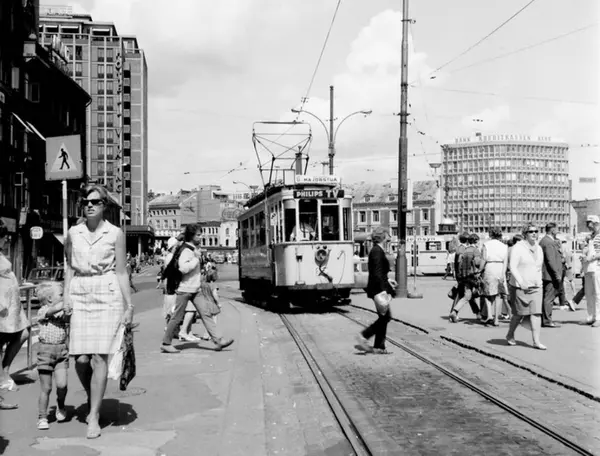 Oslo Sporveier. Trikk motorvogn 65 type SS (fra 1913) linje 6, Vålerenga- Majorstuen. Spaserende, folkeliv. Hotell Viking til venstre. Gammel Vaterlandbebyggelse i bakgrunnen. Traktorhuset.