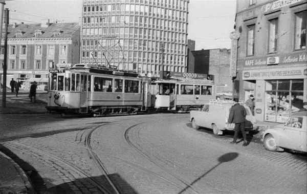 Oslo Sporveier. Trikk motorvogn 91 type SS lang, tilhenger 530 type kommunal ombygd, linje 3x, Etterstad-Skøyen. Her sett fra Vognmannsgata. Traktorhuset midt i bakgrunnen. Butikk, butikkskilt.