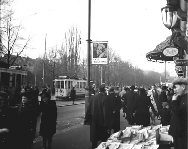 Oslo Sporveier. Trikk motorvogn type SS nr. 95 linje 17, Skillebekk-Rodeløkka, her i Karl Johans gate. Avis- og bladselger, Grand Hotel, spaserende. Skilt med Anne Crawford.