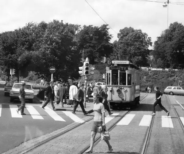 Oslo Sporveier. Trikk motorvogn 105 type SS linje 6, Majorstuen-Etterstad over Briskeby, siste dag med linjen(22. juni 1968), gamle vogner i trafikk. Her nedenfor Abelhaugen i Stortingsgata. Spaserende.