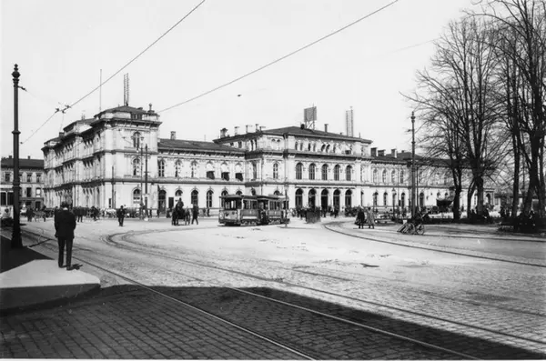 Trikk motorvogn 303 type SS (Blåtrikk) linje 2 i Strandgata og motorvogn med tilhenger 146 type Kühlstein linje 3, her svingende inn på vendesløyfa på sjøsiden av Østbanen. Blåtrikkens tidligere endepunkt til venstre ved Paleét (linje 2). Paléhagen til høyre. Folkeliv, hester, hestekjerrer. Bilde tatt en gang mellom 1915-1920.