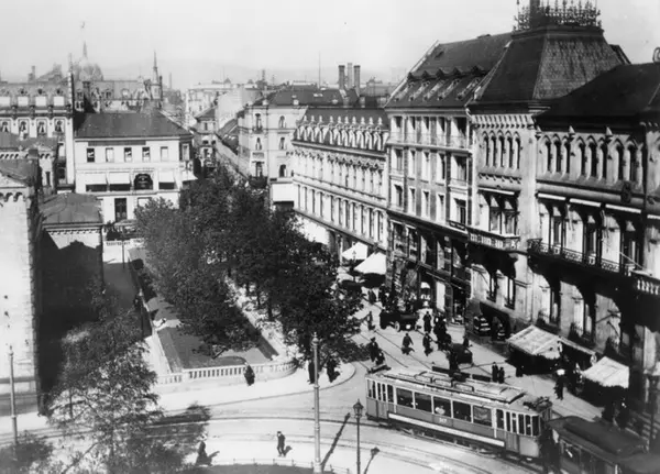 Trikk motorvogn type SS nr. 317 (Blåtrikk fra 1914) svinger ned langs Stortinget på Wessels plass fra Akersgata. Stortinget før påbygget mot Akersgata.