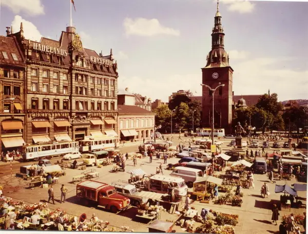 Oslo Sporveier. Stortorvet. Trikk tilhenger 635 type SS bred og motorvogn type HaWa linje 11, motorvogn type Høka MO linje 5. GlasMagasinet, Elephant-Apotheket, Domkirken. Torgbiler, torgboder, torghandel.