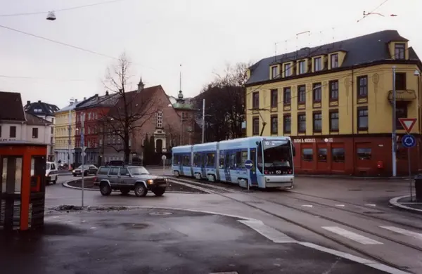 Oslo Sporveier. Trikk motorvogn 153 type SL95 linje 10 fra Jar til Rikshospitalet over rundkjøringen ved Bislett stadion. Gammeldags telefonkiosk til venstre i bildet.