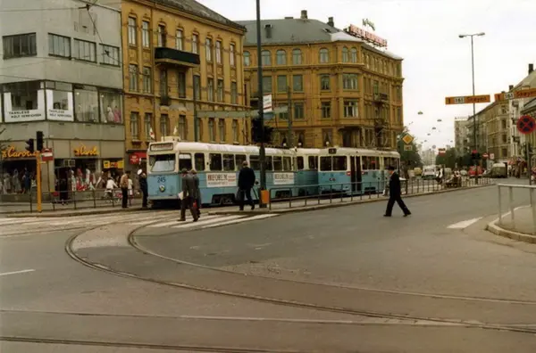 Oslo Sporveier. Trikk motorvogn 257 type MBG (Gøteborg-vogn) linje 1 og motorvogn 245 type Høka MBO, her i bruk til føreropplæring. Her på endeholdeplassen i Kirkeveien ved Majorstukrysset.
