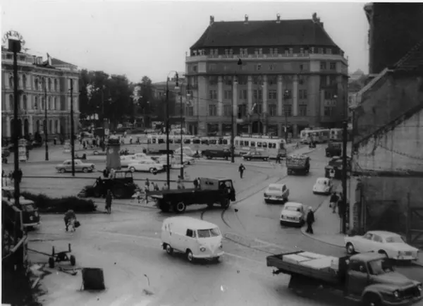 Oslo Sporveier. Trikk motorvogner type Høka MBO og tilhengere type TBO, henholdsvis linje 4 (i sløyfa) og linje 3 (på vei inn i Fred. Olsens gate). Østbanen, NAL gården. Trafikkmiljø.