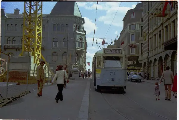 Oslo Sporveier. Trikk motorvogn 207 type Høka MBO i sløyfa ved Wessels plass mot Nedre Vollgate. Schiøllgården (Alliancegården) til venstre, forretningsgård i Akersgata 18 (Athenæumgården) bak. Byggearbeide, heisekran.